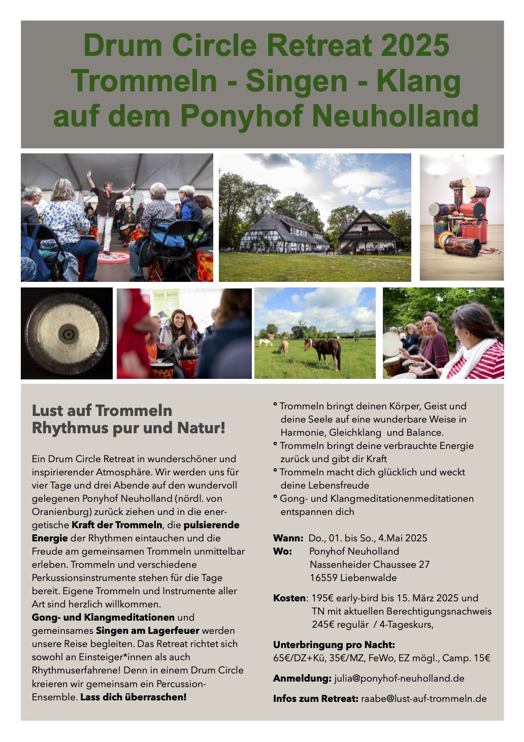 Bereits vor vielen Jahren habe ich diesen wunderbaren Ort gefunden - den Ponyhof Neuholland in Liebenwalde. Mitten in der unberührten Natur, umgeben von Pferden und Ponys kannst du deine Auszeit genießen. Verschiedene Ferienwohnungen stehen für dich bereit. Der wunderschöne Hof wird von den Zwillingsschwestern Julia und Anna seit vielen Jahren liebevoll und erfolgreich betrieben. Immer mal wieder habe ich dort Drum Circles angeboten. Nun auch ein Retreat - auf das ich mich sehr freue.