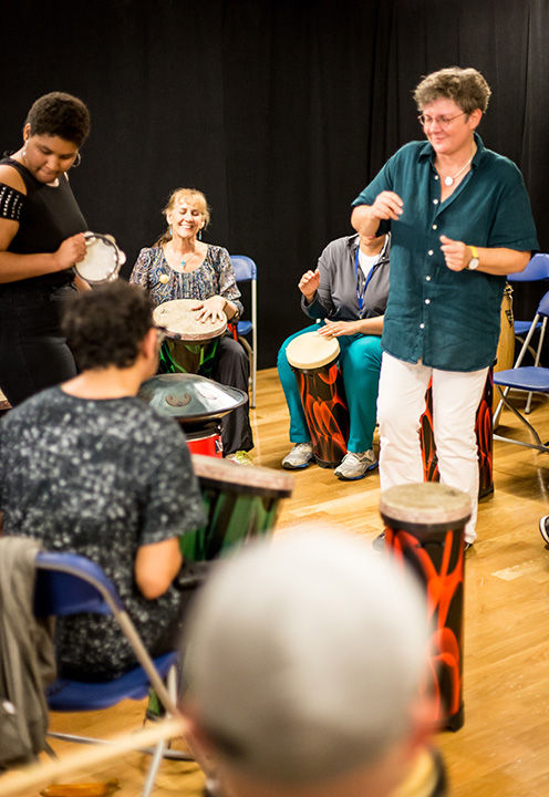 Gerne bringe ich Menschen durch Rhythmus und Trommeln zusammen. Meine Drum Circles zeichnen sich durch Authentizität, Humor und Kreativität aus und wecken die Lebensfreude! Es freut mich sehr, dass ich seit 2017 MEINL Drum Circle Facilitator bin. (Viva Rhythm®). Ich vermittle mit Leichtigkeit komplexe Rhythmen, bringe Trommeltechniken bei und binde Melodie-Instrumente mit ein.